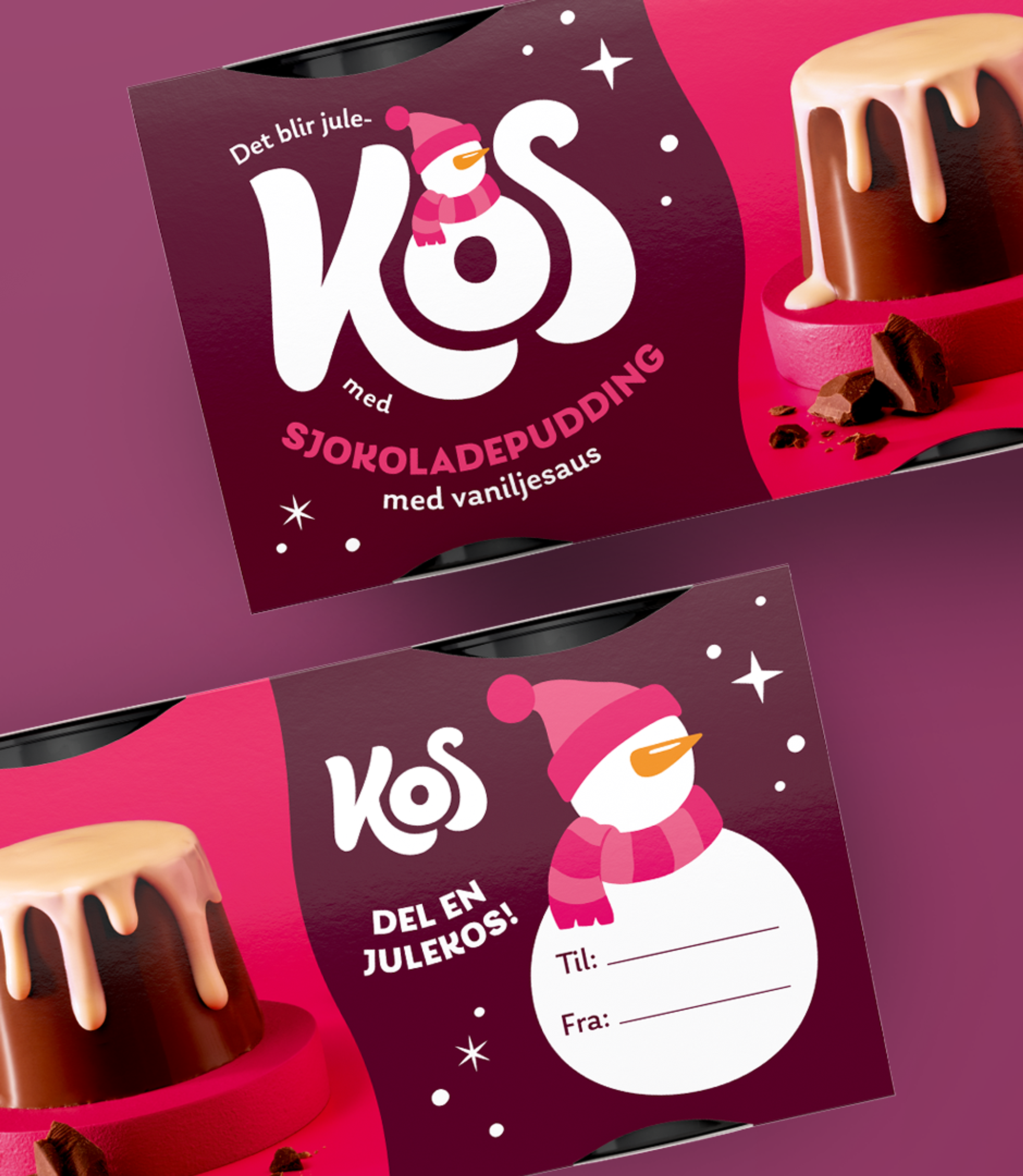Valget falt på at Kos skal være en kosepause i hverdagen – et positivt avbrekk fra livets kjas og mas. Merkevarens personlighet skulle fremstå som glad, positiv og leken. Samtidig ønsket vi å forsterke styrken i selve merkenavnet: Hvordan kan følelsen av å kose seg kommuniseres tydeligere, samtidig som vi bygger distinkte merkeelementer og øker synligheten i butikk?