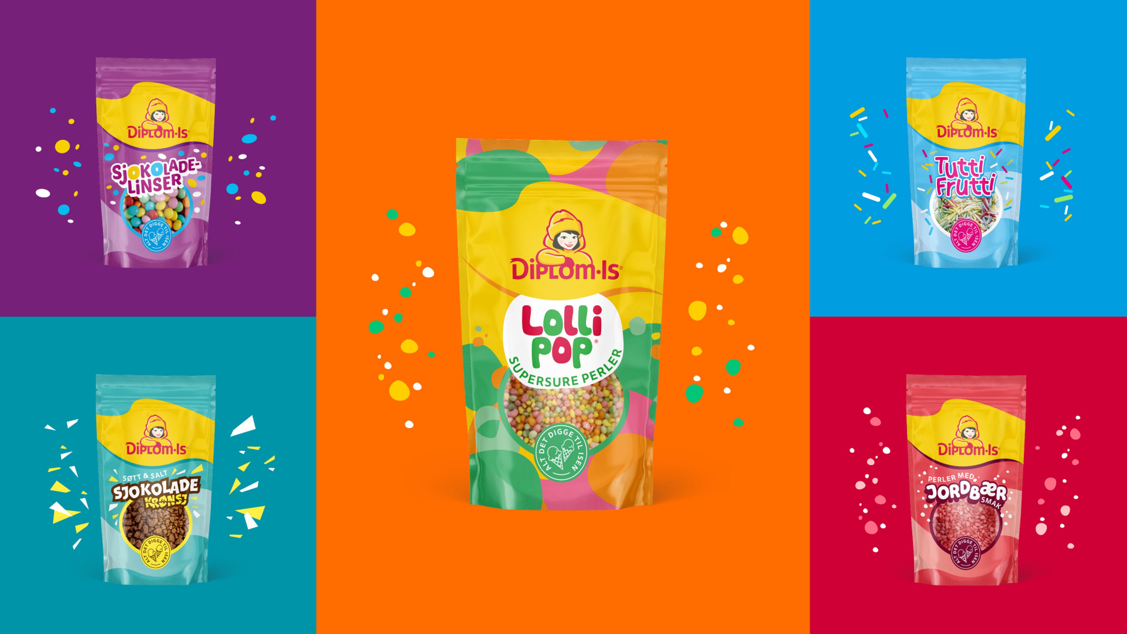 Grid utviklet et nytt designsystem som kombinerer Diplom-Is-identiteten med lekne og individuelle uttrykk for hver variant.