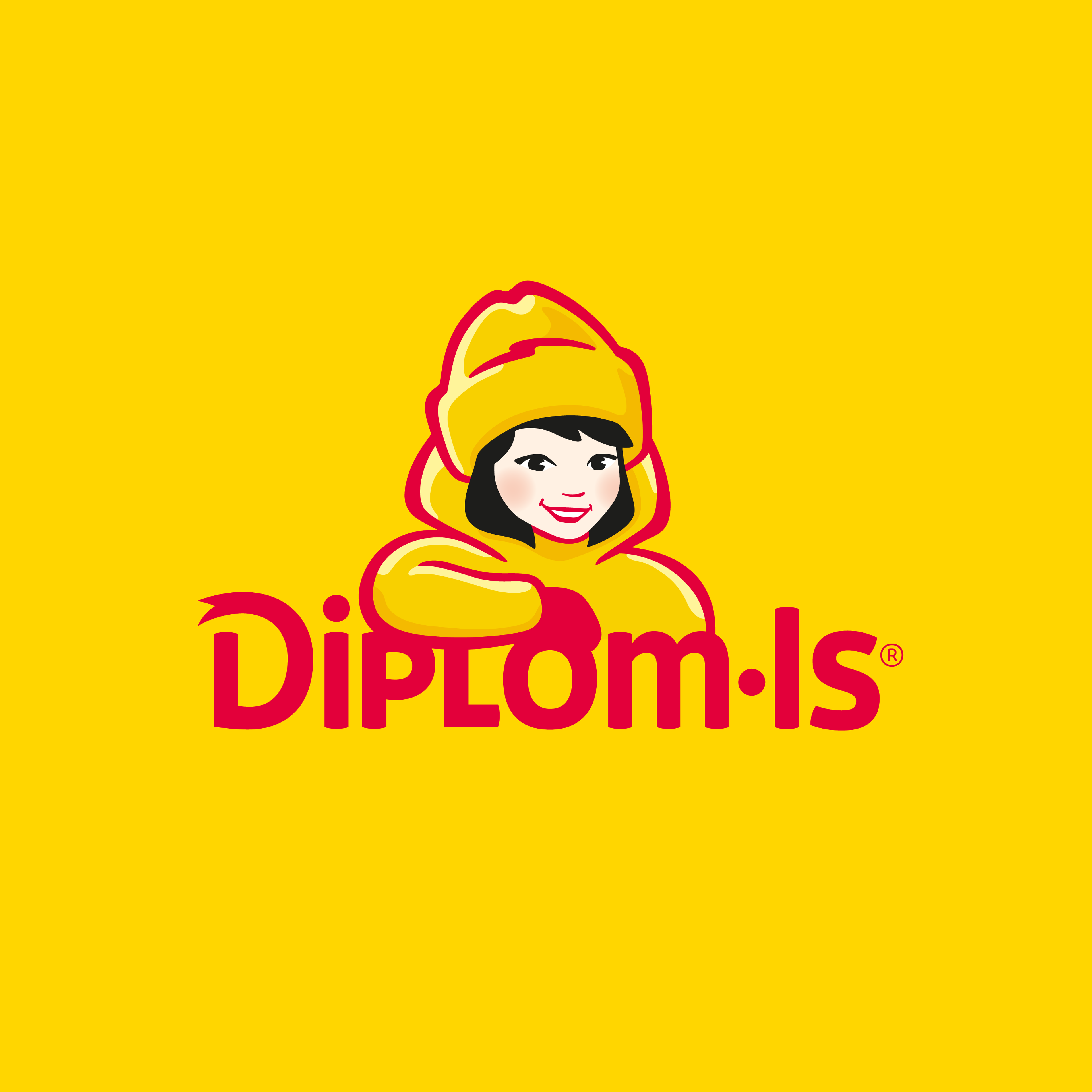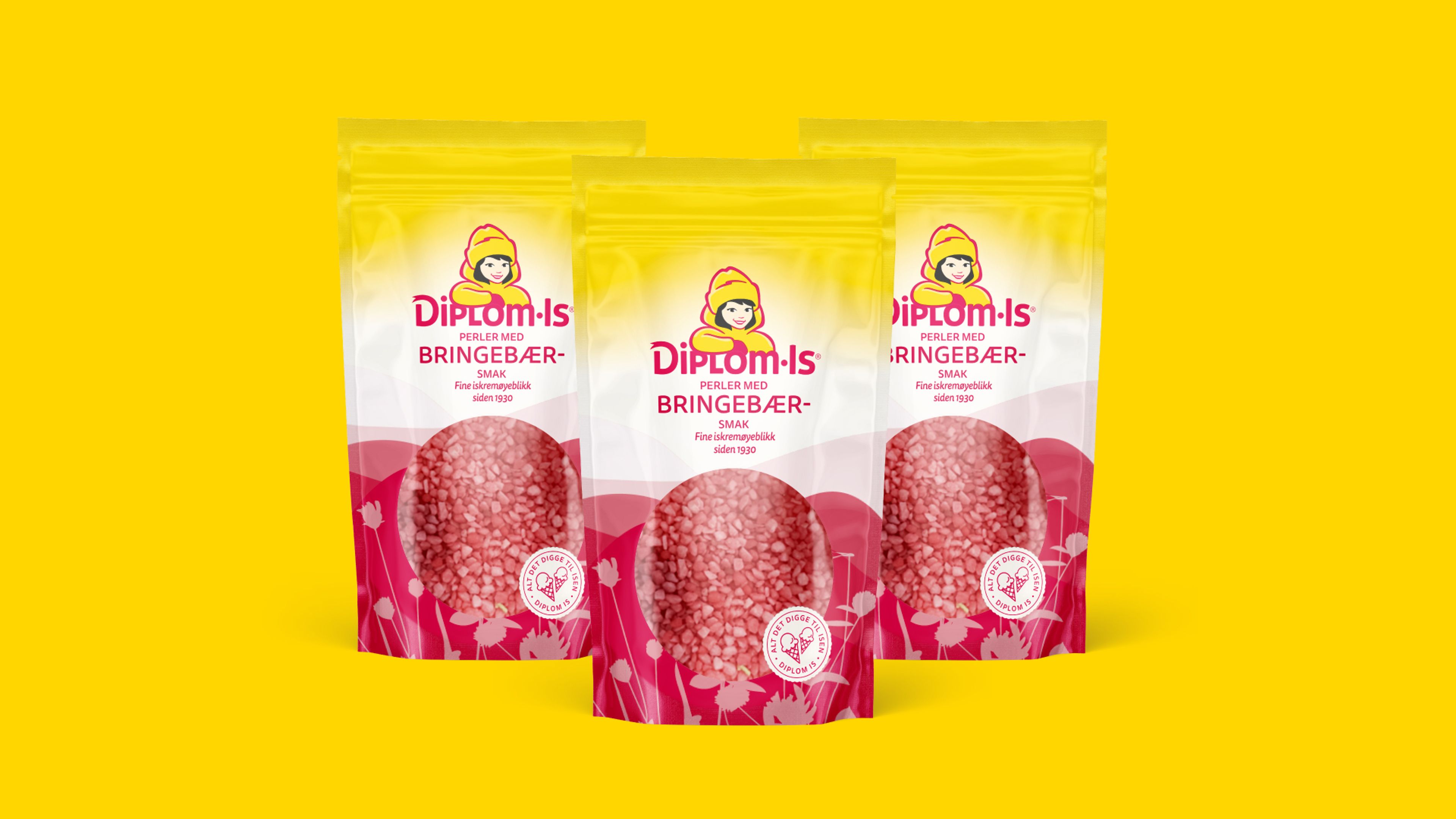 Det gule Diplom-Is-båndet med den ikoniske jenta og navnetrekket ligger som en trygg, gjenkjennelig markør på alle pakninger. Det sikrer rask merkevaregjenkjenning og sterk blokk i butikk.