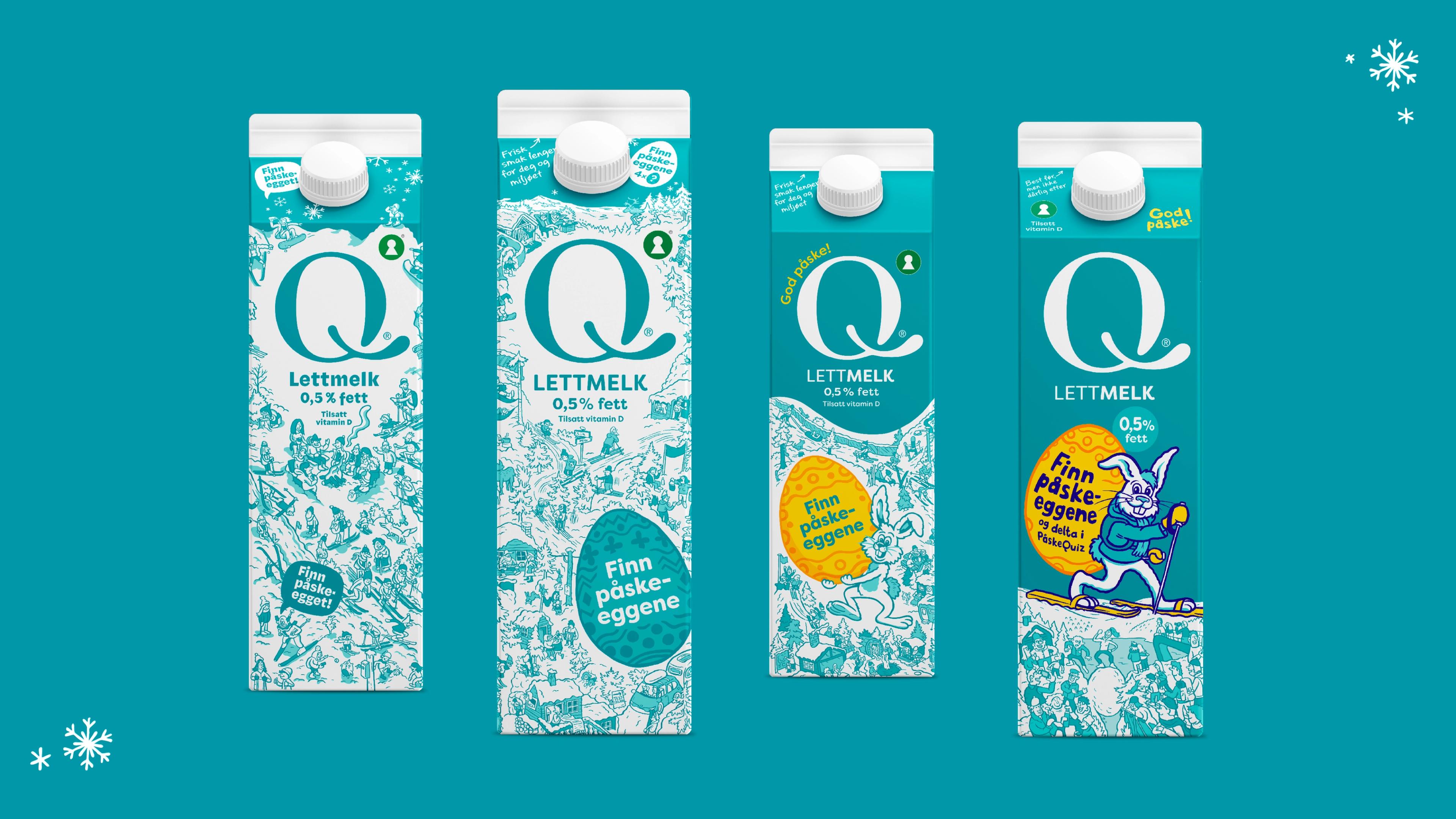 Siden 2017 har vi, i samarbeid med Q-meieriene, skapt påskemoro i pakningsdesignet gjennom myldreillustrasjoner inspirert av «Where’s Waldo». Her kan små og store lete etter påskeegg i ikoniske, norske påskemiljøer. I 2022 fikk Q-påskeharen sin faste plass i designet, og påskegleden har nå spredt seg digitalt med interaktive quizer som knytter seg til kartongen.