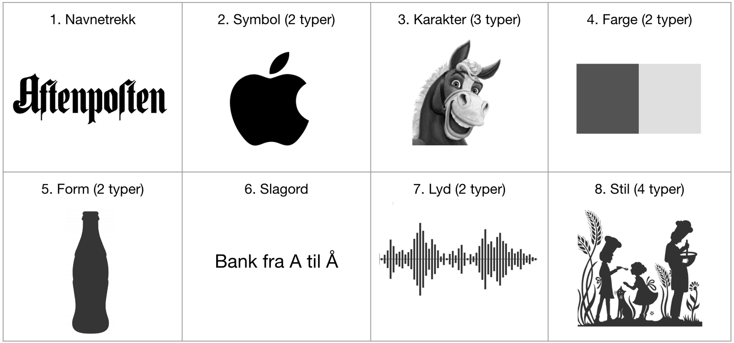 - Valg av elementer baseres på fire kriterier: 1) Lett å legge merke til og huske 2) Tilpasningsdyktig 3) Fortrinnsvis lar seg varemerkeregistere 4) Styrker posisjoneringen og reflekterer personligheten.