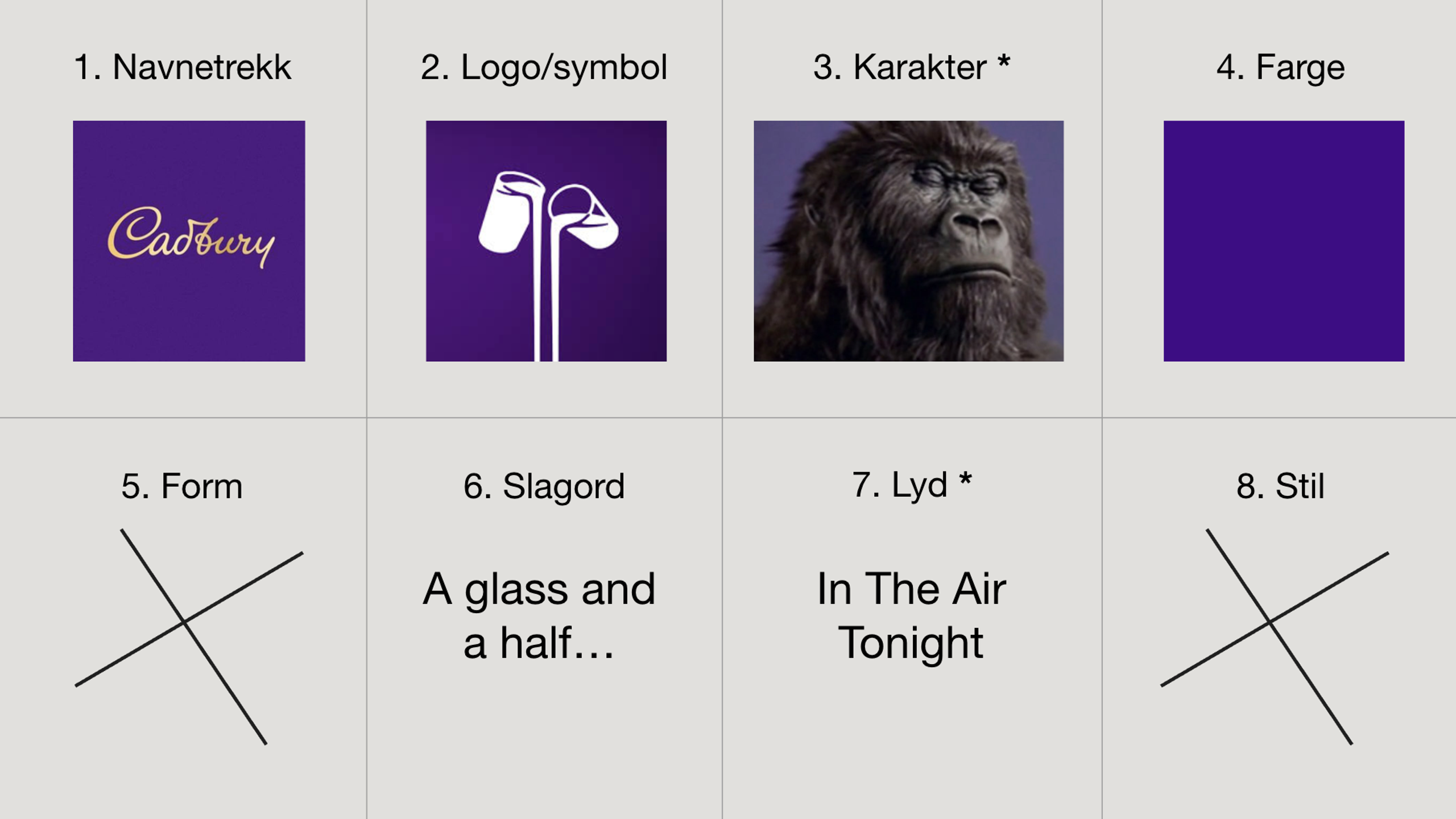 Cadbury er et eksempel: Merket skårer høyt, særlig på farge og symbol. Gorillaen* som trommer til Phil Collins-låten utviklet seg fra kampanjefigur til en merkekarakter med tydelig kobling til Cadbury – langt utover kampanjens korte varighet i 2007. Filmen fikk ikonstatus, både fordi den snudde Cadburys salg etter salmonella-krisen i 2006, og fordi den viste kraften i emosjonell, produktfri historiefortelling. Uten prioritering og investering er selvfølgelig både kjennskaps- og unikhetsskåren i dag minimal for både merkekarakteren og musikken.