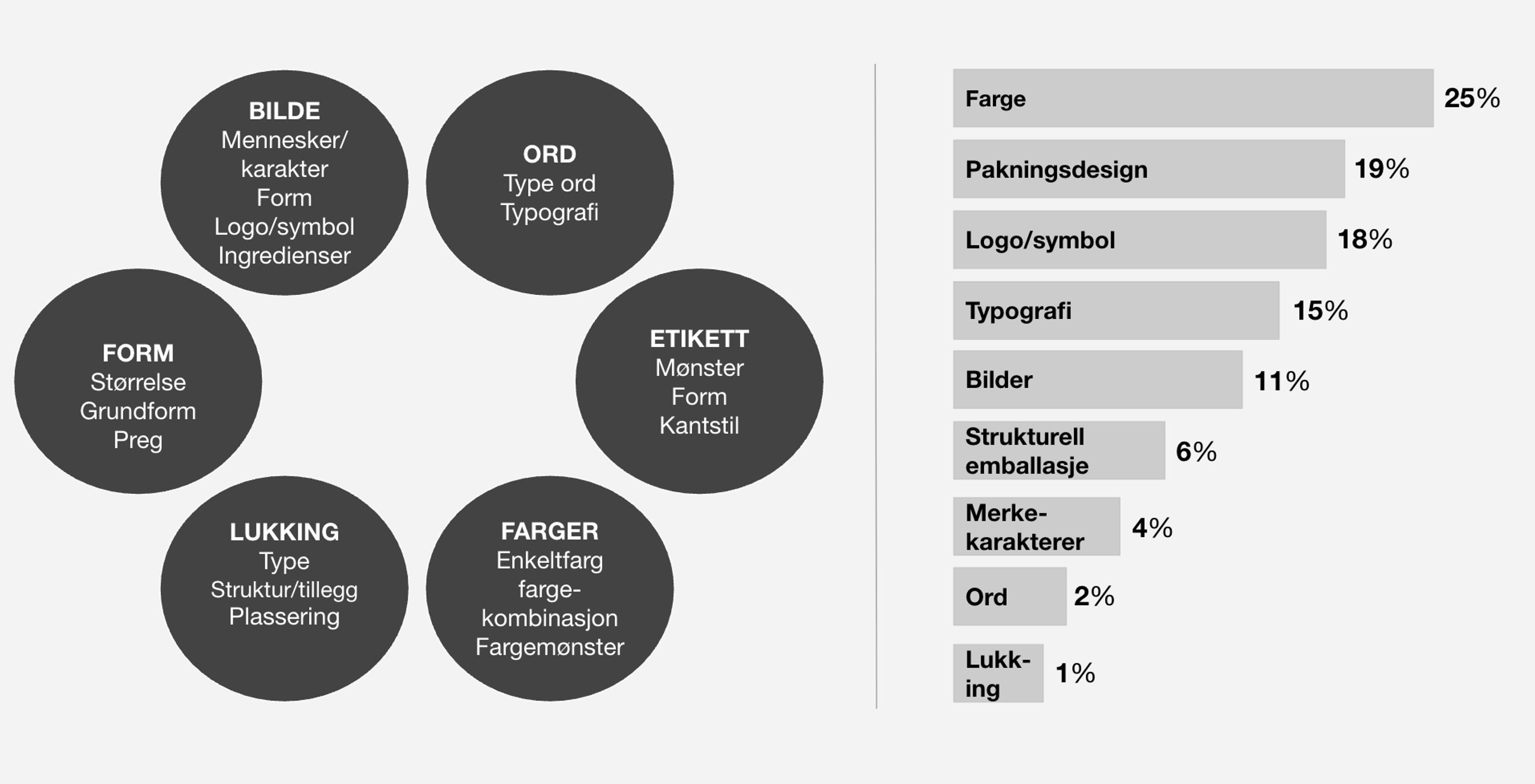 Til venstre: Bokens oversikt over ulike typer merkeelementer i pakningsdesign. Til høyre: Hvilke typer elementer som er mest brukt og oftest testet.