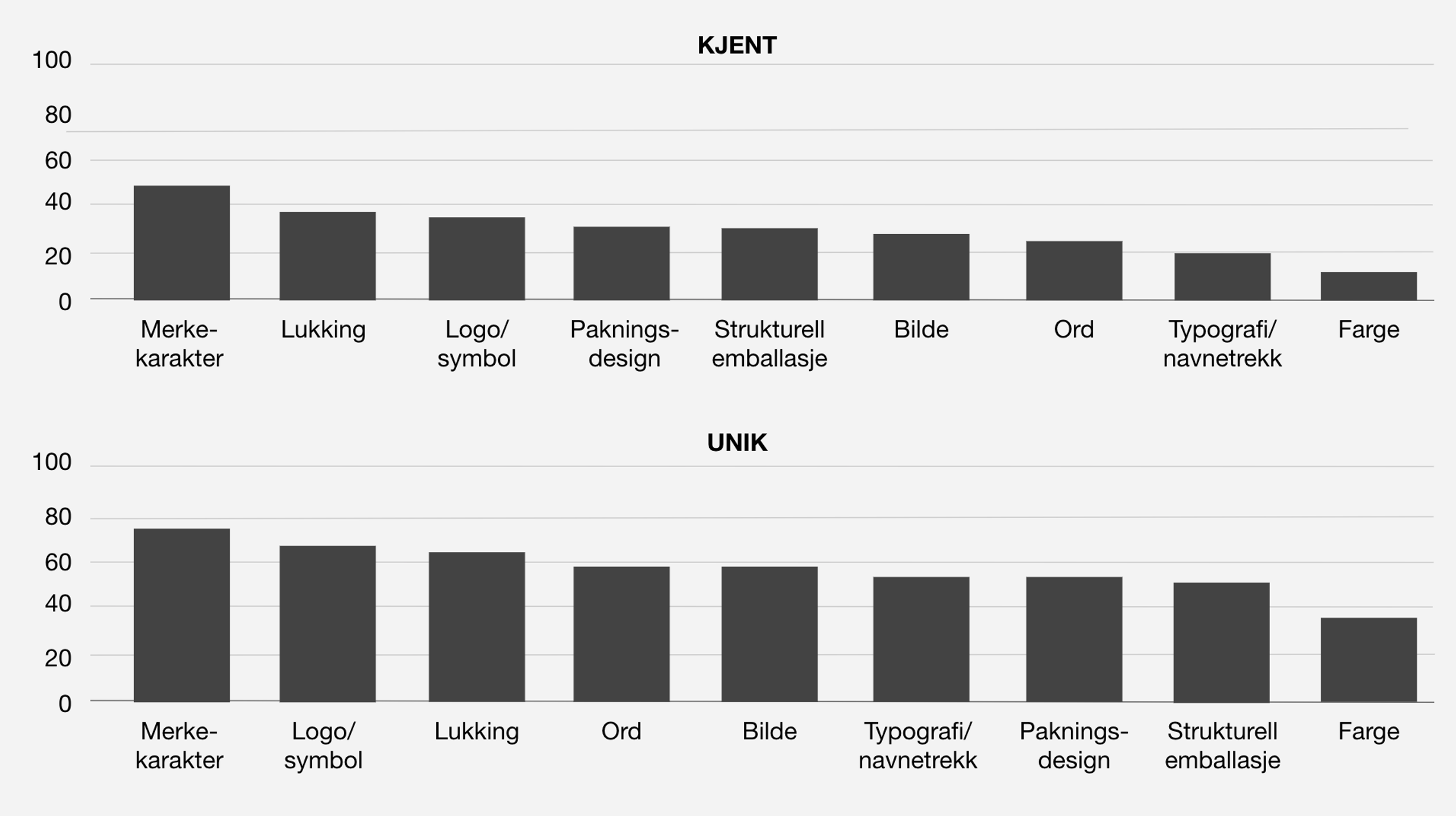 Oversikten viser hvordan ulike merkeelementer presterer relativt langs to nøkkelparametre: kjennskap og unikhet. Merkekarakter er den sterkeste merkemarkøren – farge den svakeste.