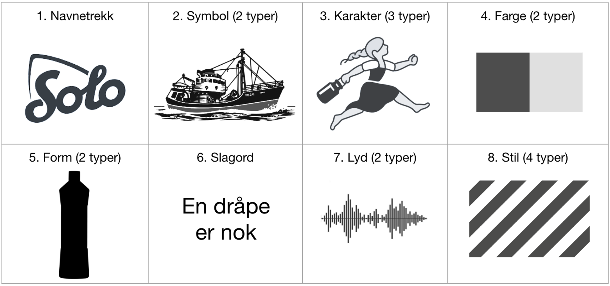 8 kategorier merkeelementer: Totalt har vi 17 kategorier når vi tar med underkategoriene. Og mange merkeelementer kan plasseres i flere kategorier.