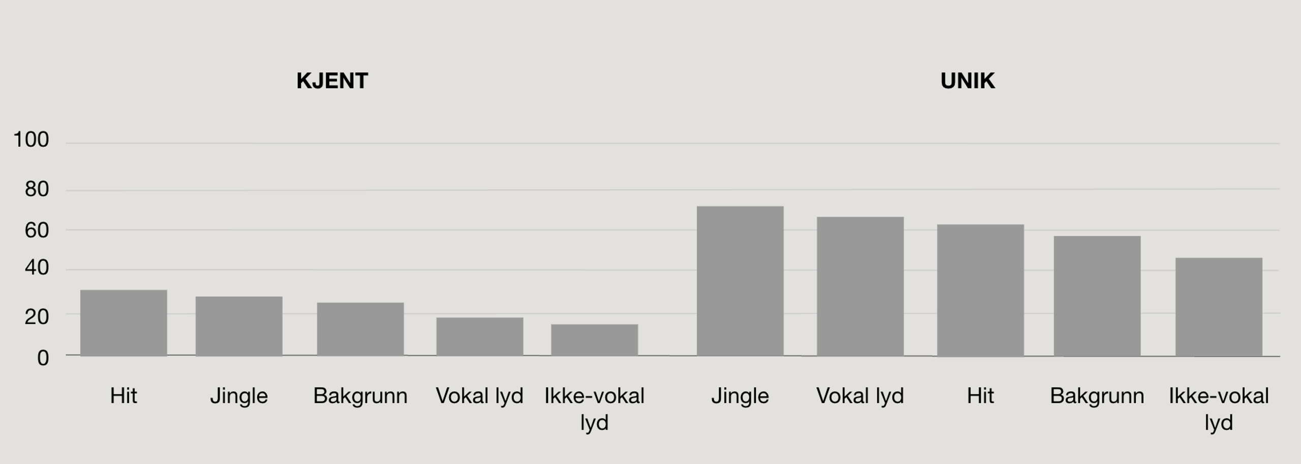 2. Populære låter - Gir umiddelbar oppmerksomhet og emosjonell respons, men er utsatt for mental konkurranse og forbindes som regel med artisten mer enn med merkevaren. Resultatet er ofte høy kjennskap, men lav grad av unikhet. For å fungere som merkemarkør må musikken brukes ofte og over tid – og ikke deles med andre merkevarer.