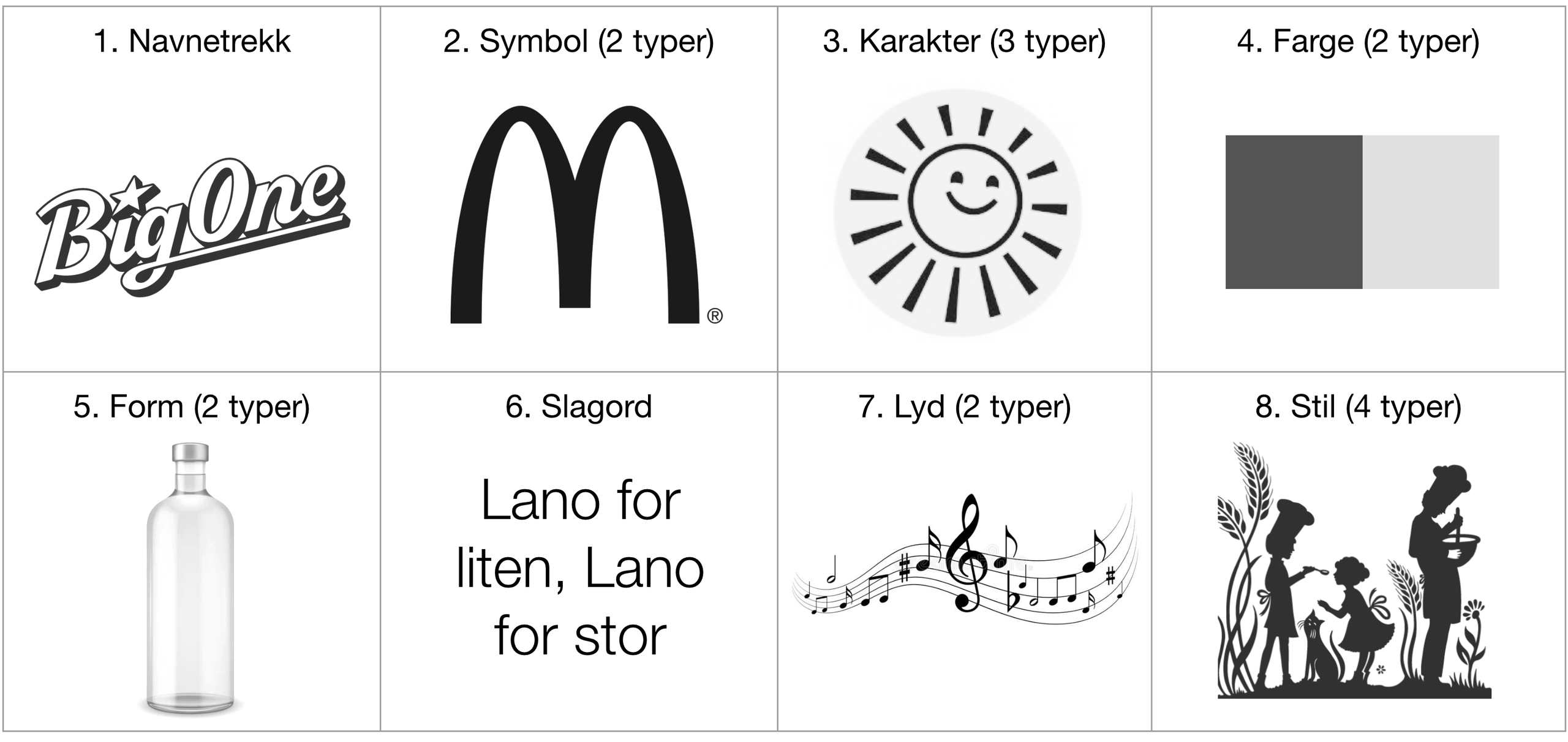 8 kategorier merkeelementer: Totalt har vi 17 kategorier når vi tar med underkategoriene. Og mange merkeelementer kan plasseres i flere kategorier.