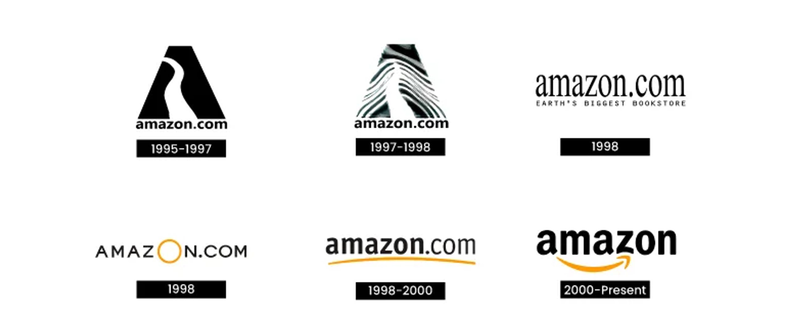 Amazons logo inneholdt varianter av en abstrahert elv i perioden 1995-98. Pilen fra A til Z, også kaldt smilet, forsterker budskapet om et altomfattende utvalg og fungerer nå også som en visuell merkemarkør ofte fristilt fra navnetrekket.